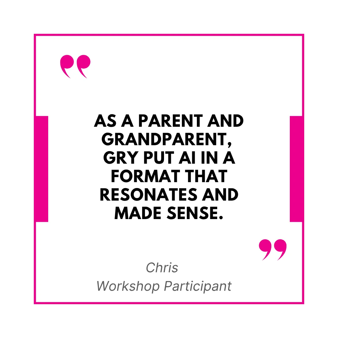 “Gry is the go-to for all things AI. Her workshops are powerful. Do yourself a favour and explore how she can help you improve your business." ~ Shirlz, Real Estate Business Owner, Workshop Attendee